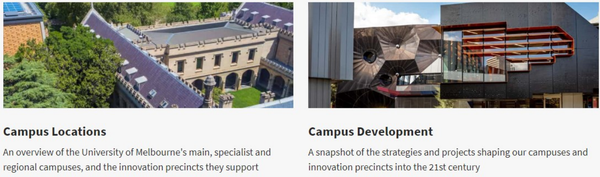 校区School Campus 墨尔本大学是一个由三个城市创新区和六个专业园区组成,遍布整个大墨尔本地区和维多利亚地区。